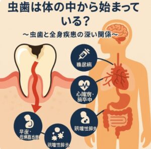 虫歯や歯周病は「口の中だけの問題」と思われがちですが、実際には全身の病気と深くつながっています。言い換えれば、口腔ケアを丁寧に行うことは、糖尿病や心臓病、さらには長寿や生活の質を守るための重要な「全身ケア」でもあるのです。