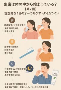 これまで、食生活・生活習慣・全身疾患との関わりを通じて「口腔の健康は体の健康と直結する」ことを見てきました。今回はその総まとめとして、朝から夜までの理想的なオーラルケアの流れをご紹介します。日々の習慣に、安全で高性能な歯磨き剤「バイオペースト」を取り入れることで、さらに効果的に歯と体を守ることができます。